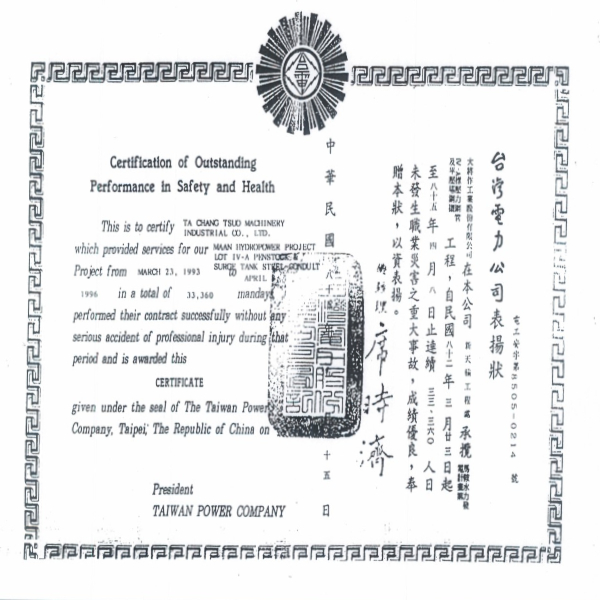85.05 台電頒發表揚狀-馬鞍水力發電計畫第IV-A壓力鋼管及平壓塔鋼襯工程